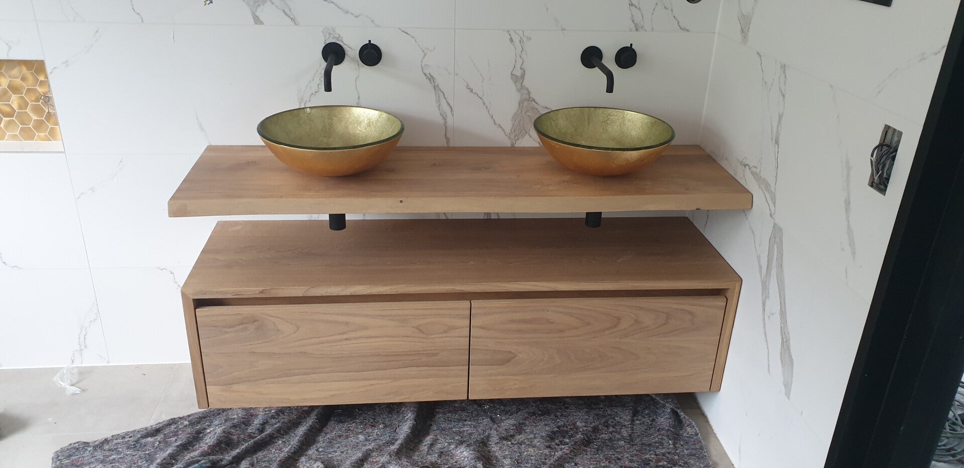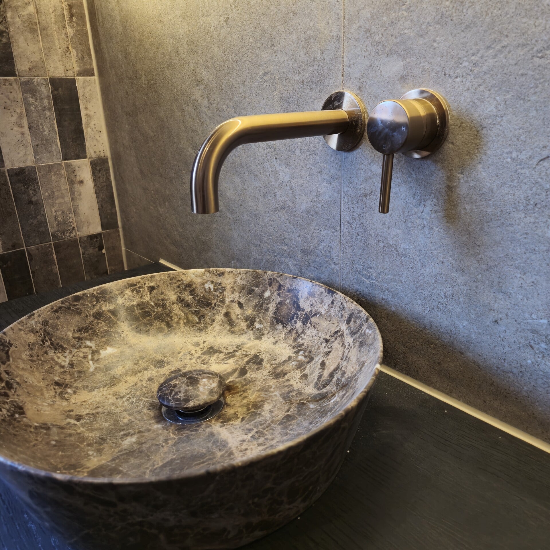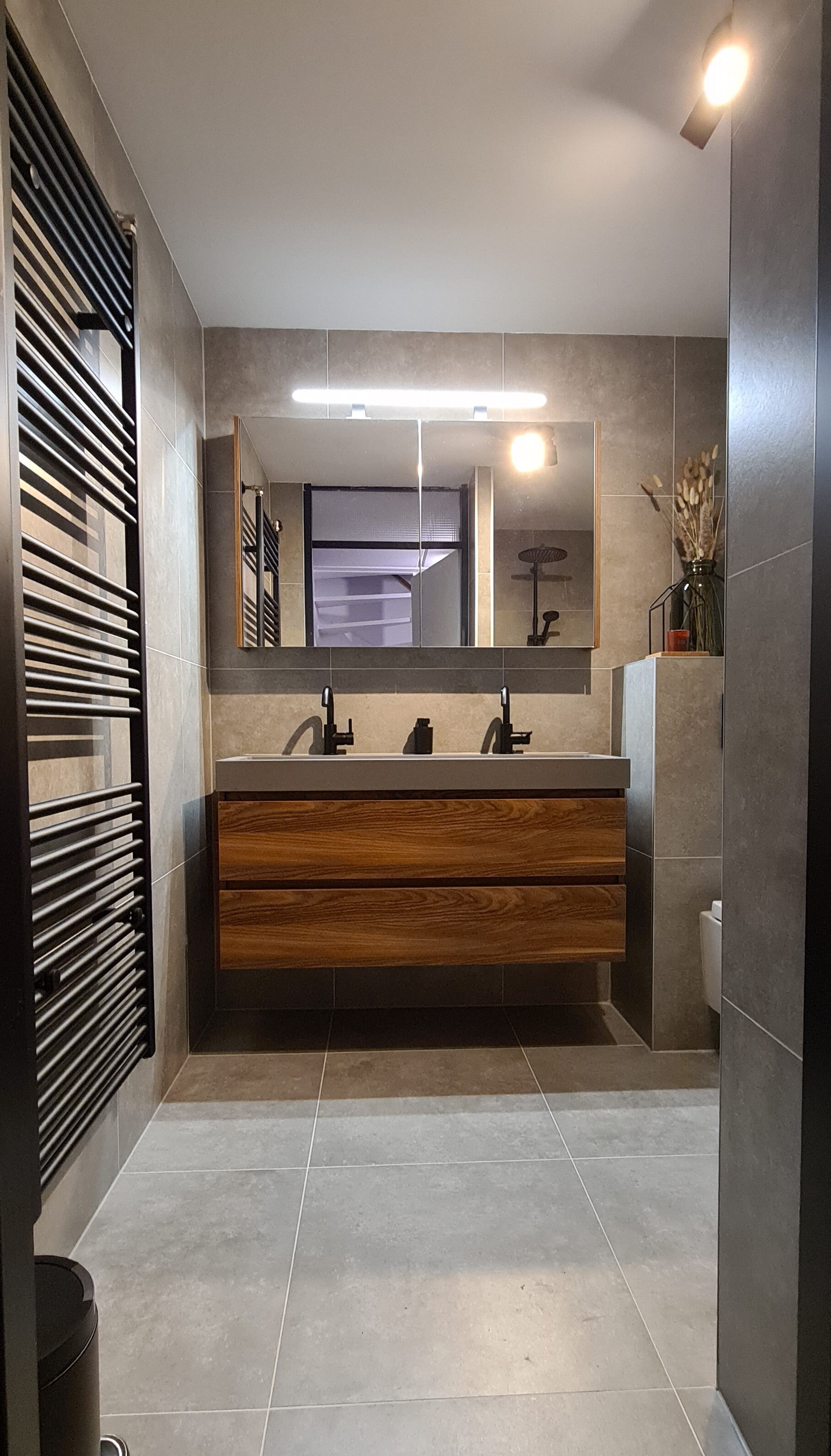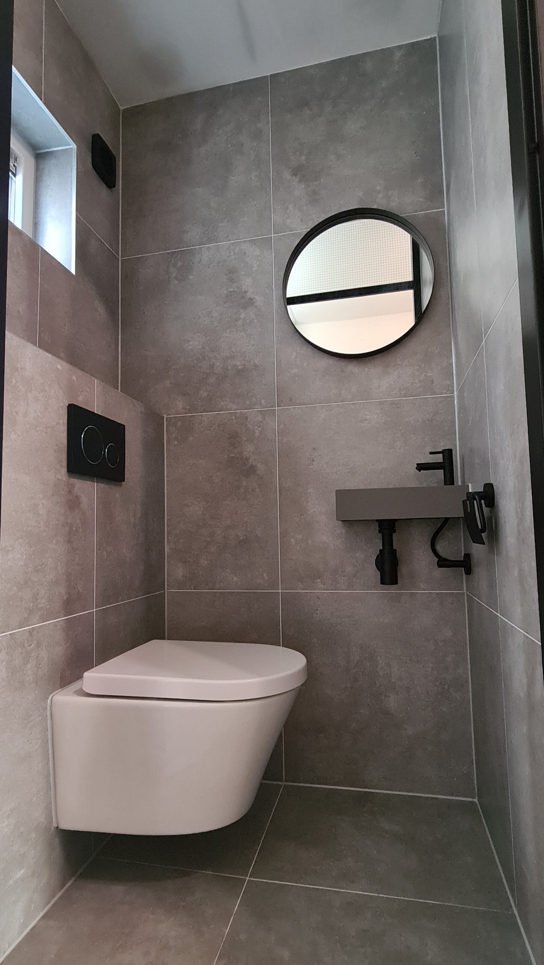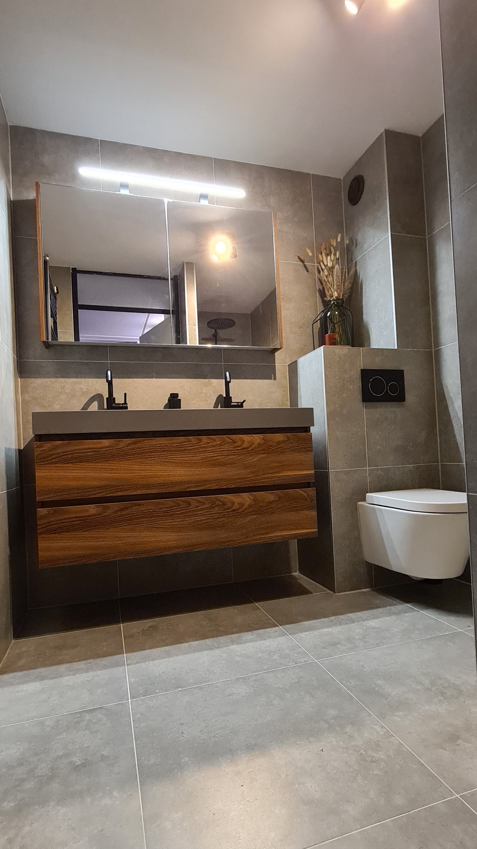 We hebben al het leidingwerk volledig vernieuwd en netjes ingefreesd. De wc in de badkamer is een kwartslag gedraaid voor een betere indeling en de koof is opnieuw vakkundig gemaakt. Voor de wanden en vloeren heeft de klant gekozen voor prachtige, strak aangebrachte 60x60 cm tegels.