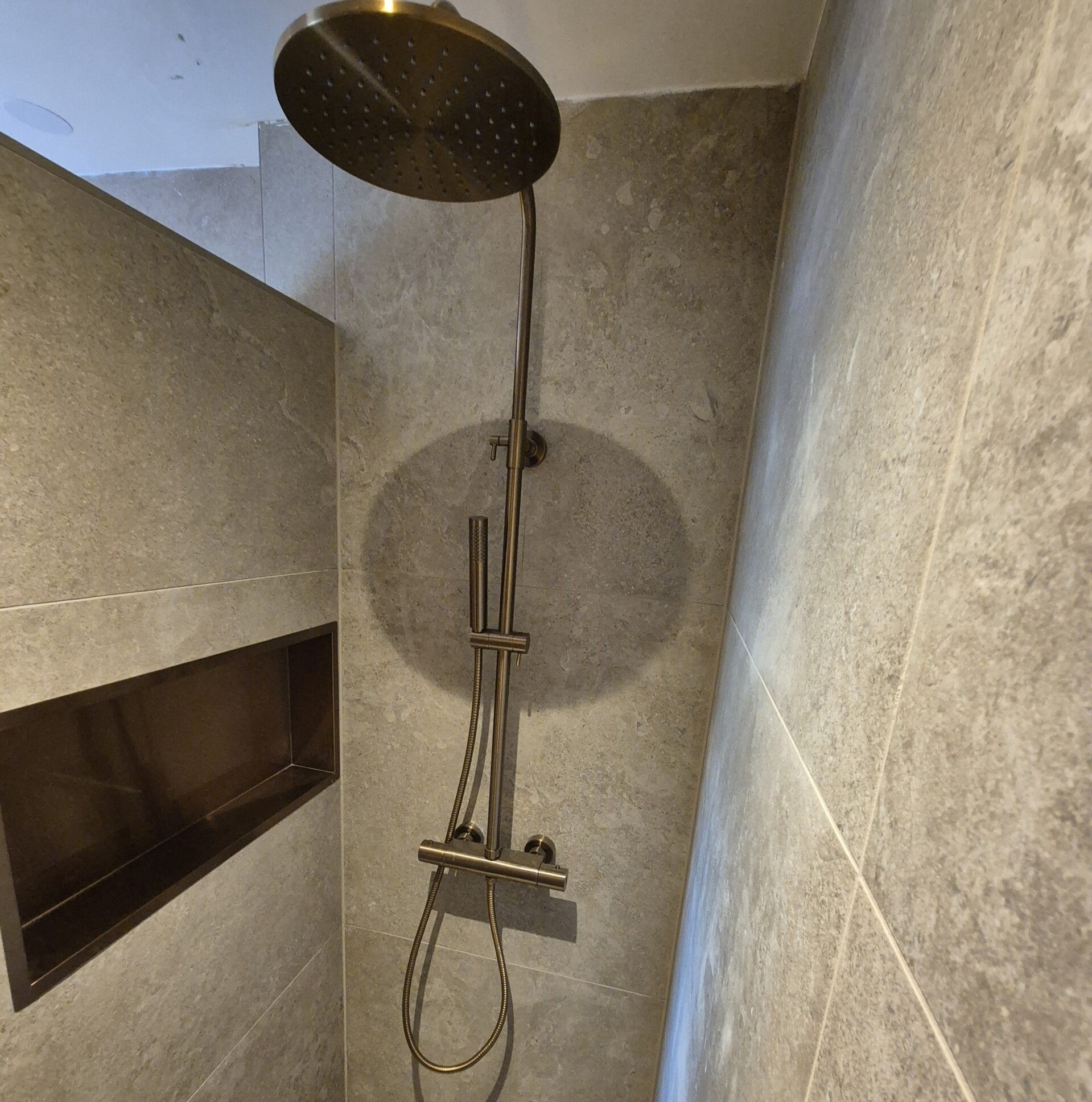 We hebben een prachtige inbouwkraan geïnstalleerd en de slaapkamer vergroot, waardoor de doucheruimte nu op de plek van de voormalige wastafel is gesitueerd. De ruimte is afgewerkt met een verlaagd, gestukt plafond voorzien van stijlvolle inbouwspotjes.